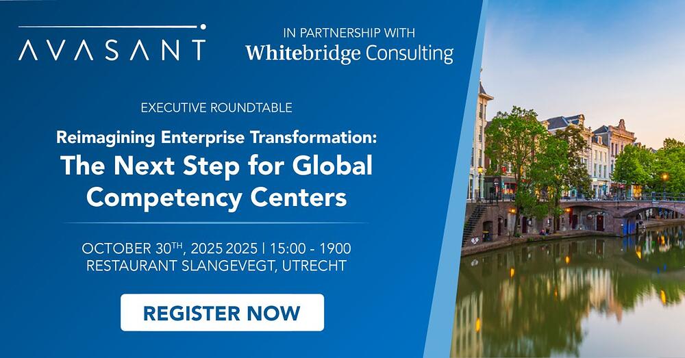 Global Competency Centres are entering a new growth phase with exciting developments that make GCCs relevant for Benelux companies. Together with Avasant, we are organising a round table meeting on 30 October at Buitenplaats Slangevegt in Breukelen.